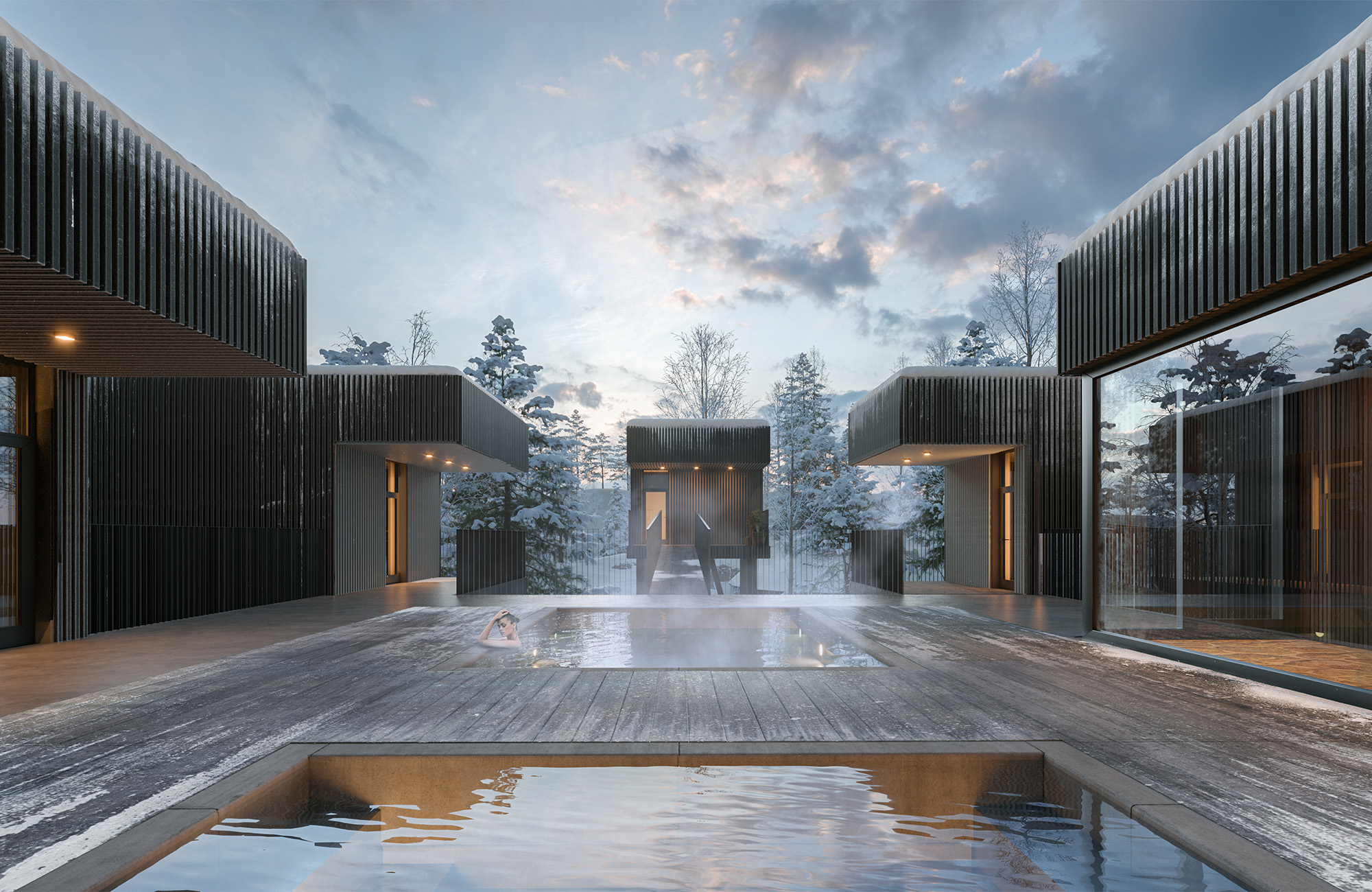 提供多層次座位,設計以景觀為優先,大片窗戶與大型桑拿爐將光線引入,融合傳統與廣闊湖景。