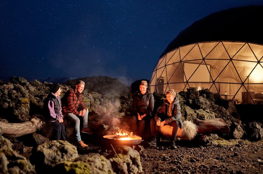黑夜前往營地追蹤極光,圓頂屋散據在荒蕪的熔岩原之上,牆體半面砌以抗寒的透明材質可抵禦酷寒的氣候。內部為極光觀景廳,設有長桌與長凳,鋪以柔軟的毛皮椅墊,一邊看著戶外營火喝着熱飲,一邊細聽關於極光的故事。