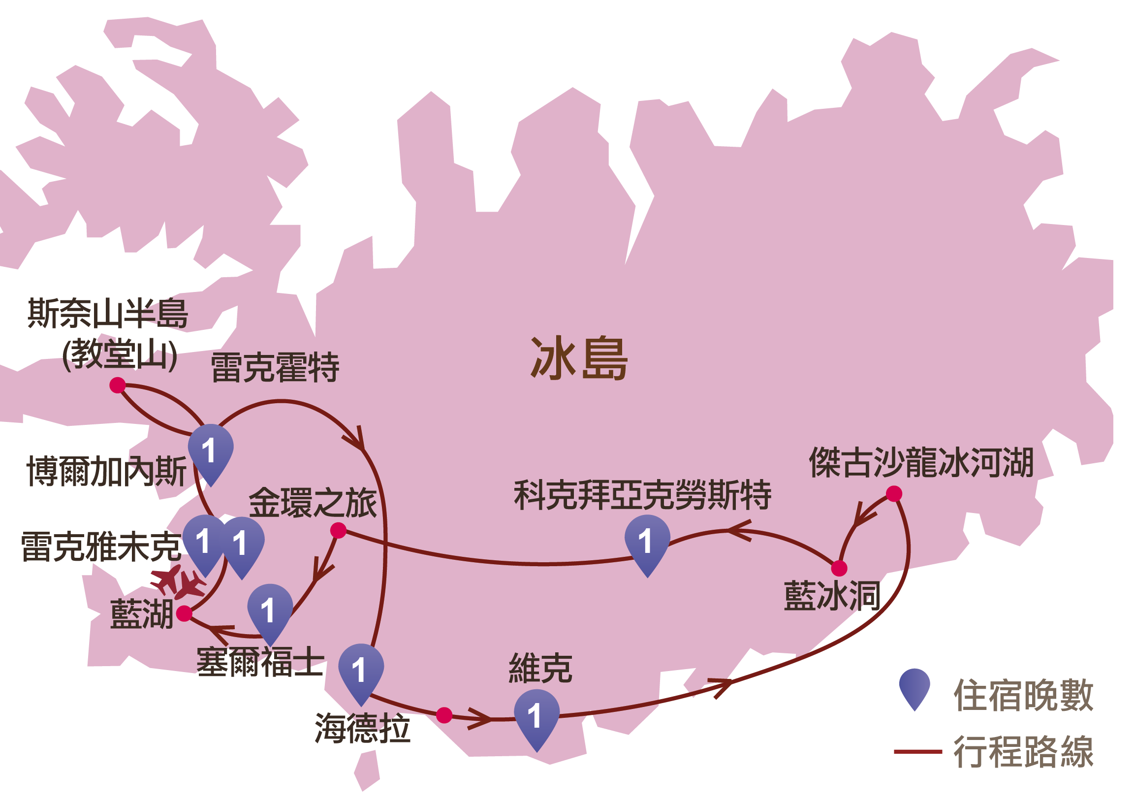 冰島︰雷克雅未克、阿克拉內斯、斯奈山半島教堂山、博爾加內斯、雷克霍特、海德拉、維克、傑古沙龍冰河湖、鑽石沙灘、藍冰洞、科克拜亞克勞斯特、塞爾福士、藍湖