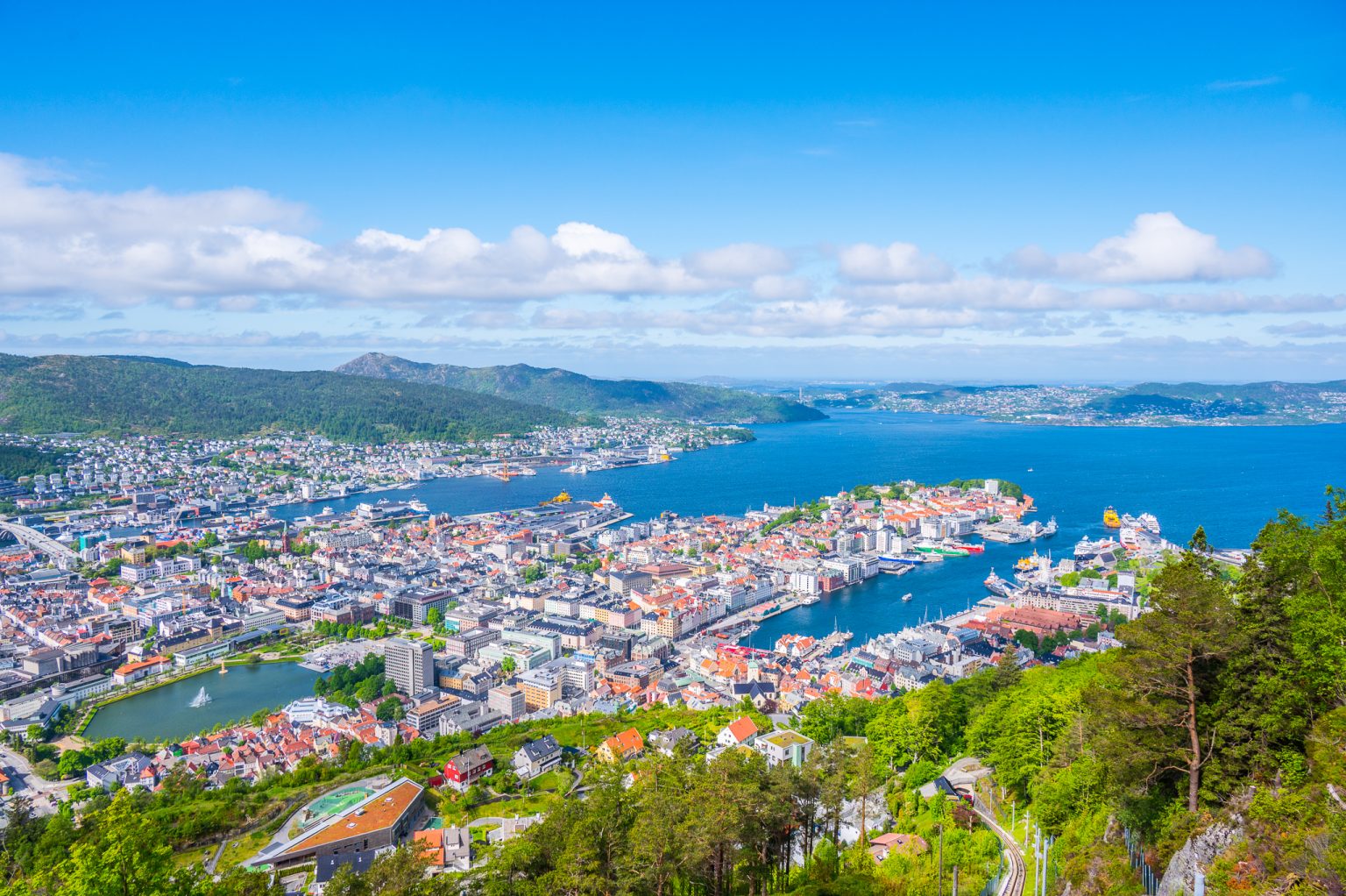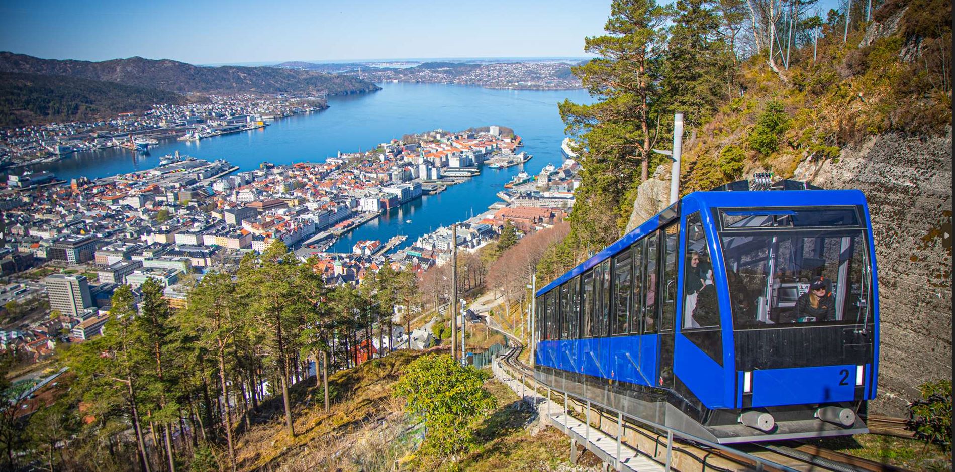 搭乘纜車登上佛洛依山頂,俯瞰卑爾根市容及 峽灣海口壯觀美景。