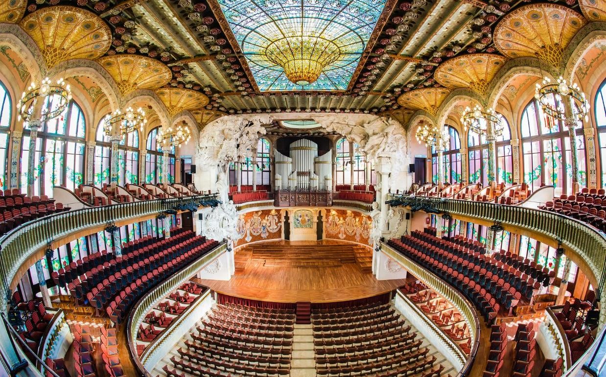 是擁有「花之建築師」的現代主義設計師多明尼克的作品,和聖十字聖保羅醫院同被列為世界文化遺產。音樂廳頂部的彩色玻璃天窗,形如倒置水晶杯,內部以大量馬賽克磚、花朵為主題的彩繪玻璃最為著名。