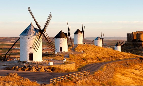 白色風車群在一片無垠的平原排列展開,構成典型拉曼查地區的鄉村風景。17世紀西班牙文豪塞萬提斯,就是以白色風車村這片空靈大地創作出世界名著《唐吉訶德》,藉以反諷當時主流的騎士制度。
