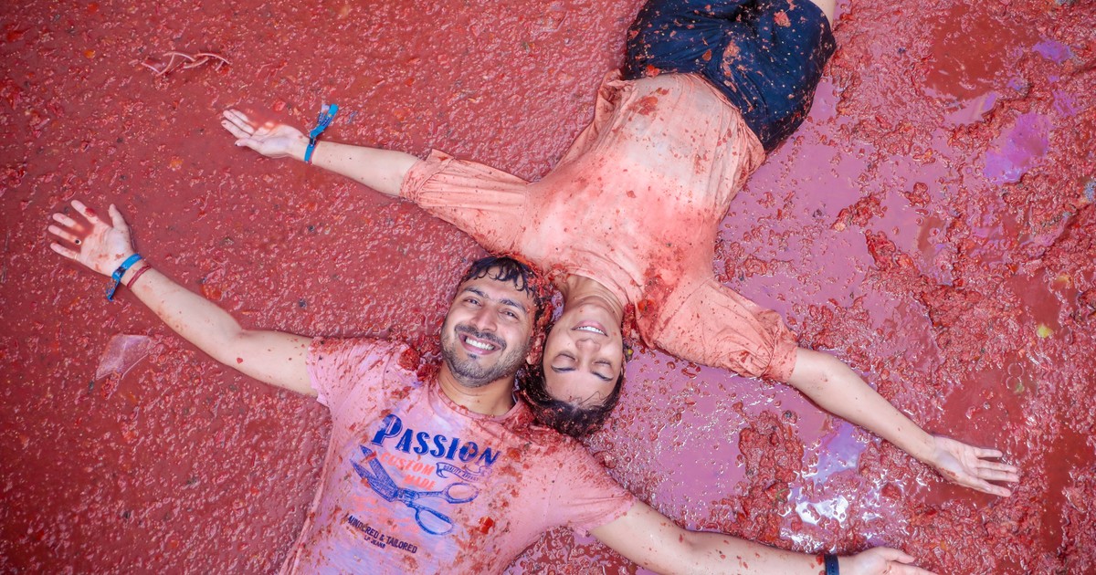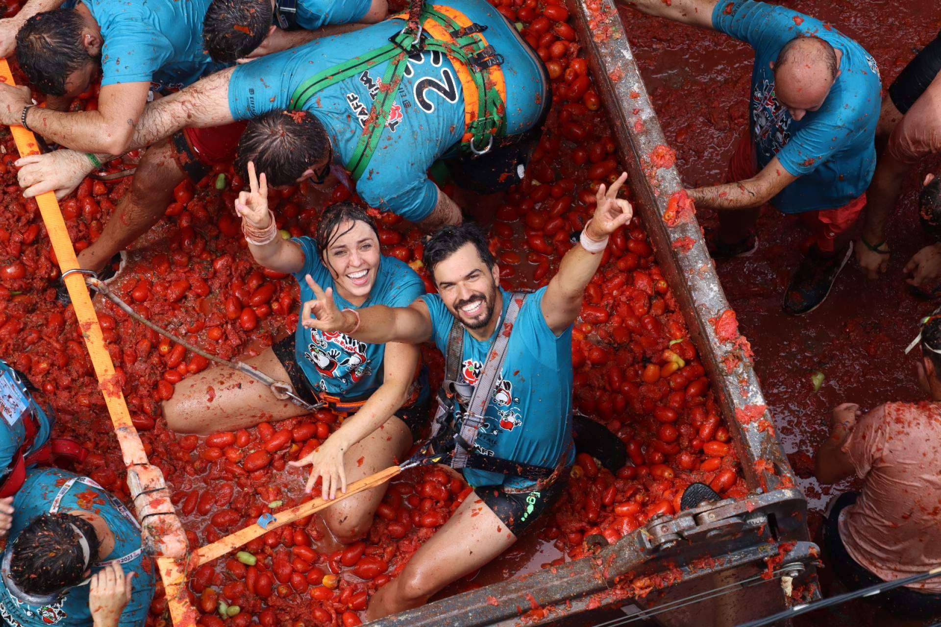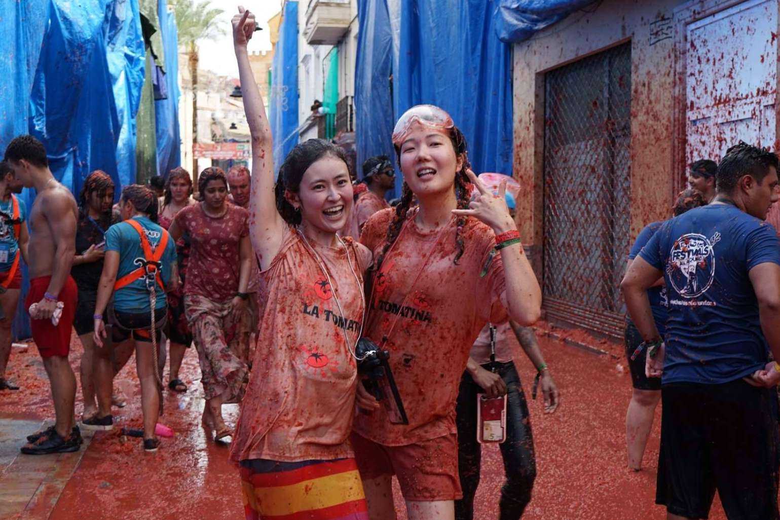 前往布紐爾小鎮~蕃茄節節慶會場。由「搶火腿大賽」揭開序幕,隨著一聲信號開始,卡車會運來大量的熟蕃茄,參加者們互相丟擲蕃茄,每個人全身被染紅,蕃茄沾在臉上、頭髮上,現場充滿著歡笑與濃郁蕃茄香氣,場面熱鬧非凡。過程大約持續一個小時,戰鬥結束後,街道和參與者會被大量的蕃茄汁弄得一片狼藉,參與者會共同清理街道,展現環保意識。