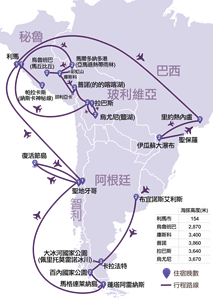秘魯 :利馬、坦博帕塔國家自然保護區(亞馬遜雨林)、庫斯科、 烏魯班巴、馬丘比丘古城、彩虹山、胡利亞卡、普諾(的的喀喀湖)、帕拉卡斯、巴雷斯塔思島