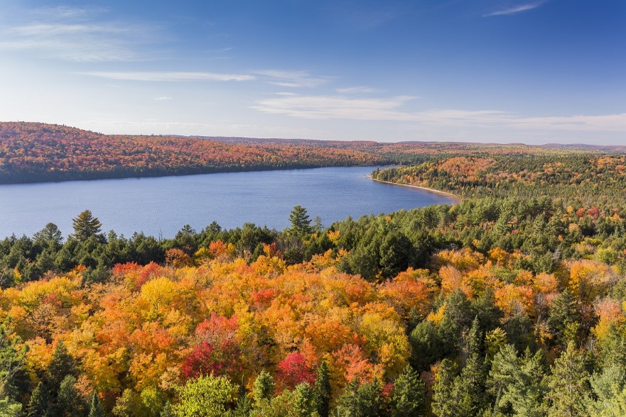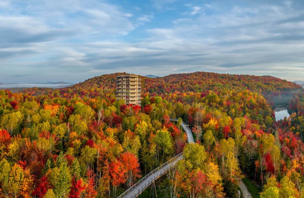 漫步於森林頂層的空中步道。木棧道上,欣賞壯闊的聖羅倫斯河與洛朗山脈全景。其核心是一座高約40公尺的螺旋觀景塔,登頂後能360度俯瞰秋日楓紅。
