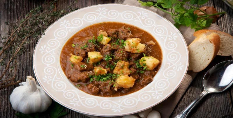起源於九世紀的匈牙利草原,是當地牧羊人用牛肉、洋蔥及野草香料在大鍋中慢燉而成的傳統料理。隨著時代變遷,奧斯曼人將紅椒(Paprika)帶入匈牙利,這種甜中帶辣的紅椒粉成為燉牛肉的靈魂調味料,牛肉經長時間燉煮後軟嫩入味,膠質豐富。這道菜不僅是家庭聚餐的經典,也是匈牙利民族遷徙與鄉土情懷的象徵。