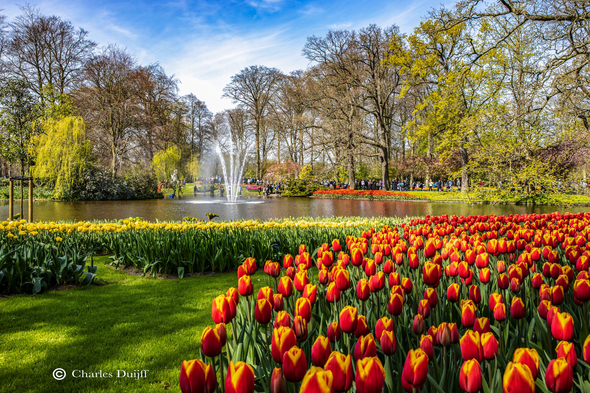 「庫肯霍夫花園」在15世紀時主要種植貴族廚房所需的草藥和蔬菜,園區占地約33公頃,是世界上最大的花園之一,每年只有在3月下旬到5月上旬才對外開放,吸引世界各地的遊客進場參觀。園區內種植了數百個不同品種的鬱金香及數以百萬計的花卉,更設有水池、噴泉等造景,互相襯托下構成美麗的畫面,忍不住按下相機的快門。