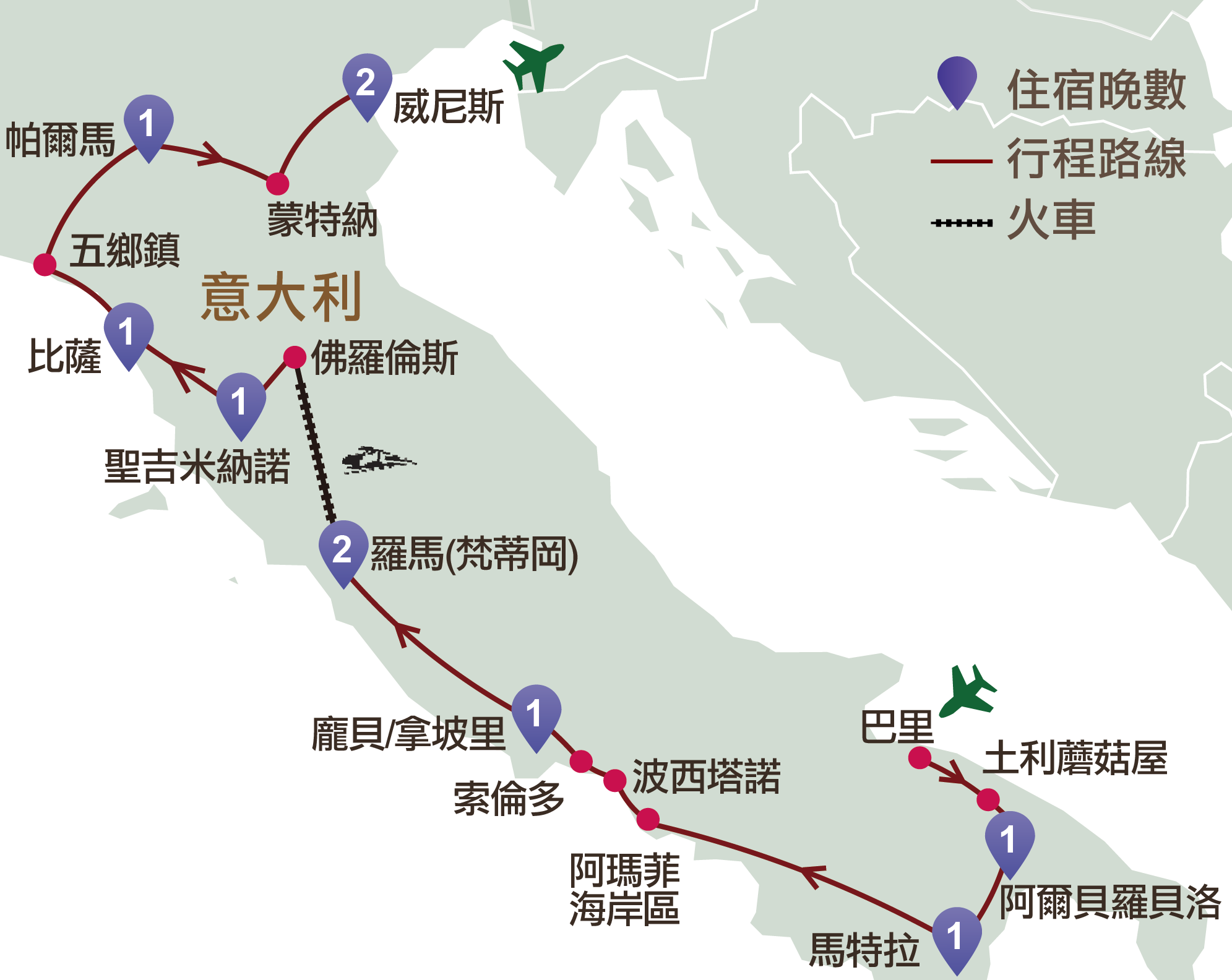 巴里、阿爾貝羅貝洛、馬特拉、阿瑪菲、龐貝、索倫多、拿坡里、羅馬(梵蒂岡)、佛羅倫斯、聖吉米納諾、基安蒂、聖米尼亞托、比薩、五鄉鎮、帕爾馬、蒙特納、威尼斯