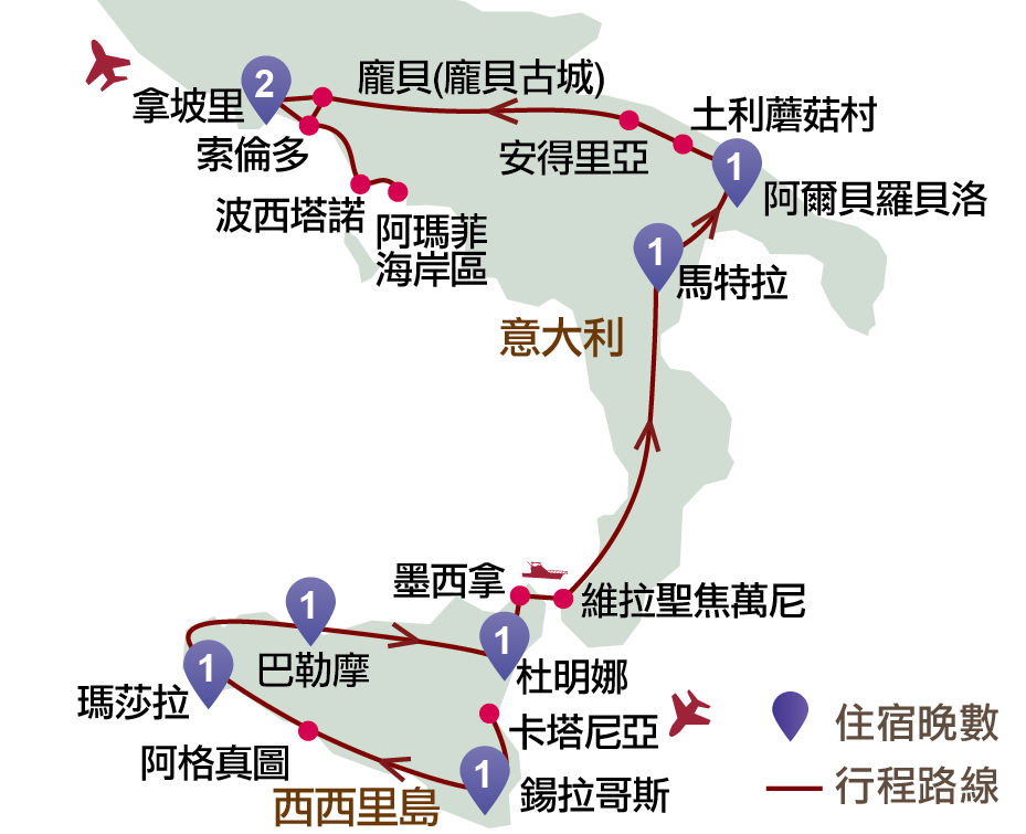錫拉哥斯、阿格真圖、瑪莎拉、特拉帕尼、巴勒摩、杜明娜、馬特拉、阿爾貝羅貝洛、安得里亞、龐貝、拿坡里、索倫多、阿瑪菲、波西塔諾、龐貝古城