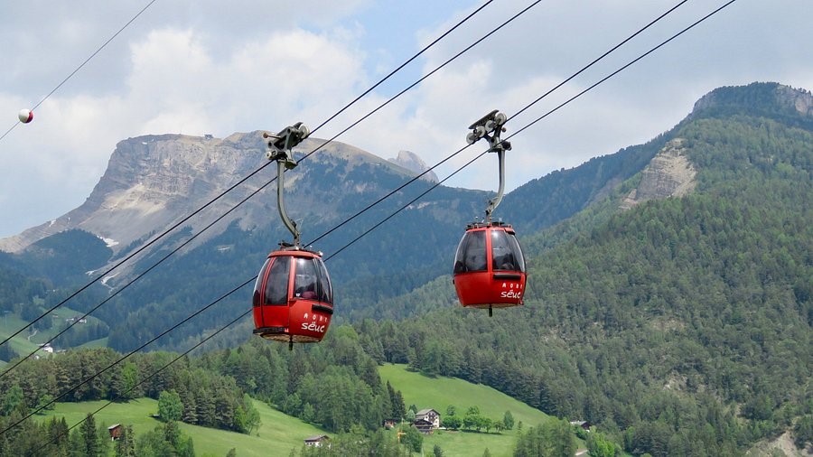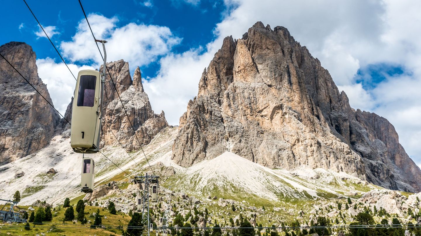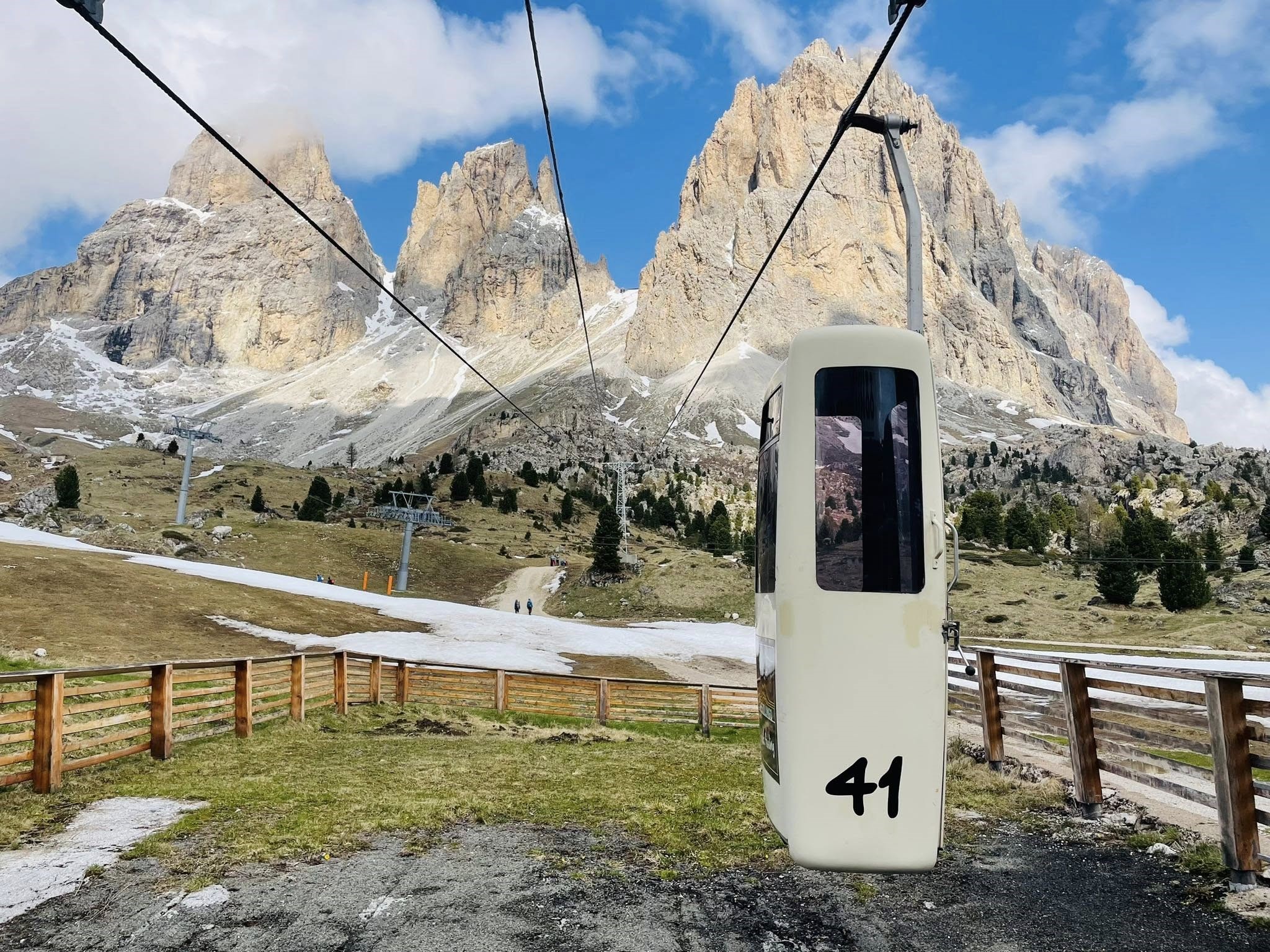 Forcella del Sassolungo: 直立式膠囊纜車︰多洛米蒂山脈最具標誌性纜車之一,形狀獨一無二,狹長型車廂空間最多僅可容納2名乘客站立搭乘,路線沿山勢起伏,一路欣賞開揚景色,末段纜車隨岩壁變得陡峭而猛烈爬升,彷彿穿峽而過,粗糙的礫石近在咫尺,刺激感難以言喻。