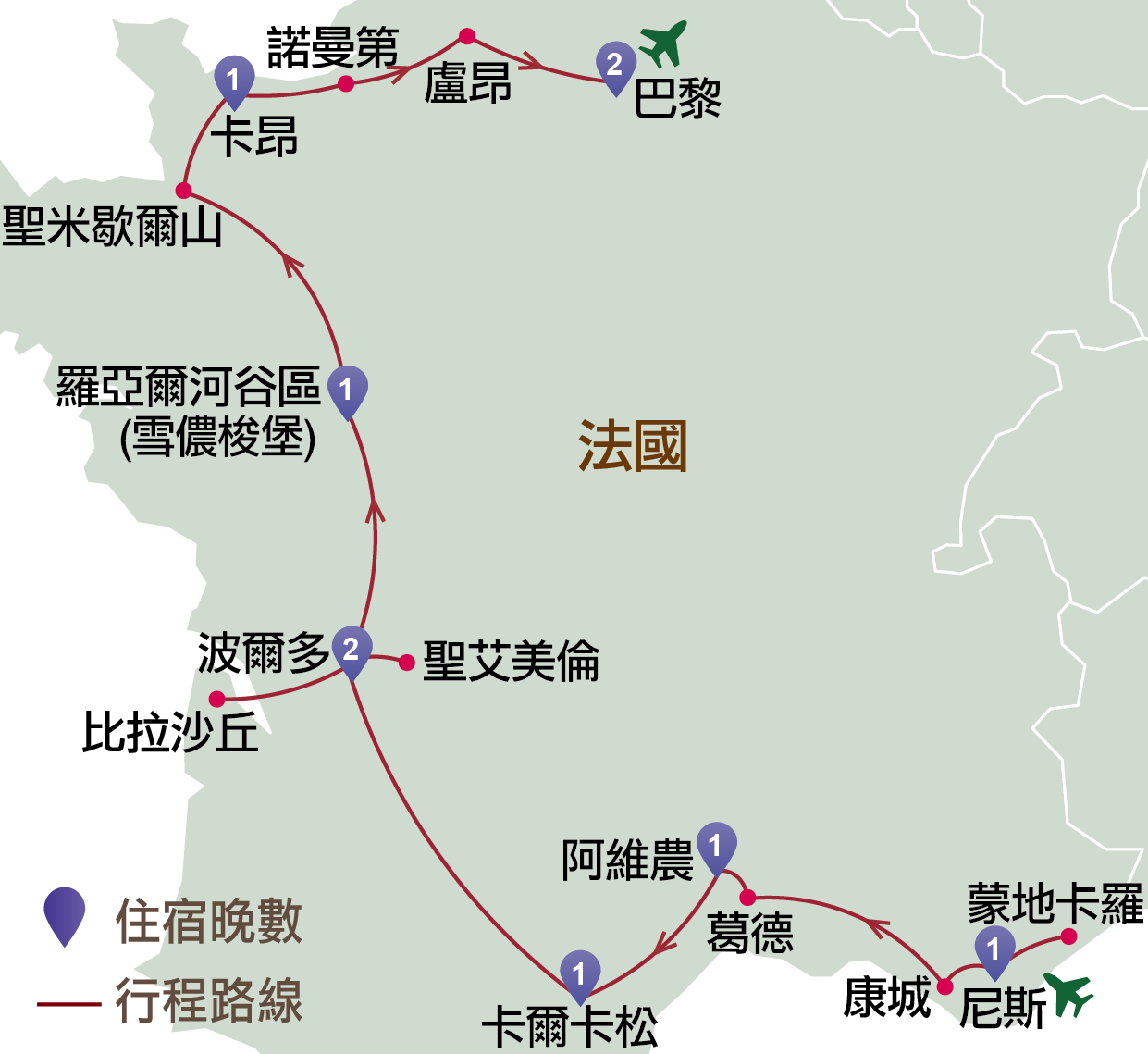 法國:尼斯、康城、葛德、阿維農、卡爾卡松、波爾多、比拉沙丘、聖艾美倫、羅亞爾河谷區、聖米歇爾山、卡昂、諾曼第、巴約、盧昂、巴黎