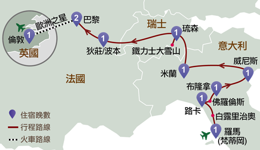 是歐洲旅遊非常受歡迎的路綫,包羅藝術、文化及歷史;亦是尊賞假期的皇牌行程。品味文藝復興時代的絕世風華,宏偉的建築及巧奪天工的工藝雕塑,永恆之城~羅馬,文藝興發源地~佛羅倫斯,迷人水鄉~威尼斯,綻放令人陶醉的古典情懷,使人目不暇給。享負盛名的鐵力士大雪山,擁有世界首創的360°旋轉登山纜車及攝人美景;時尚大都會~巴黎及倫敦,讓人目不暇給。