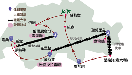 名列世界文化遺產的觀光鐵路,沿途高度落差高達海拔 1,800 公尺,雪嶺雄峰,冰川美景,蔚為奇觀。在普斯提亞沃谷地的360 度轉彎拱橋,鬼斧神工的建築技術與景觀, 更是令人讚嘆不已。