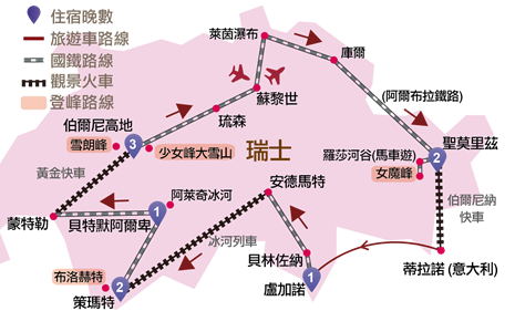 **鐵道團全程以瑞士鐵路系統之交通工具,包括火車、纜車、吊車、公共巴士及郵政巴士等作為主要交通工具;