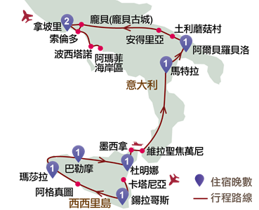 錫拉哥斯、阿格真圖、瑪莎拉、特拉帕尼、巴勒摩、杜明娜、馬特拉、阿爾貝羅貝洛、安得里亞、龐貝、拿坡里、索倫多、阿瑪菲、波西塔諾、龐貝古城
