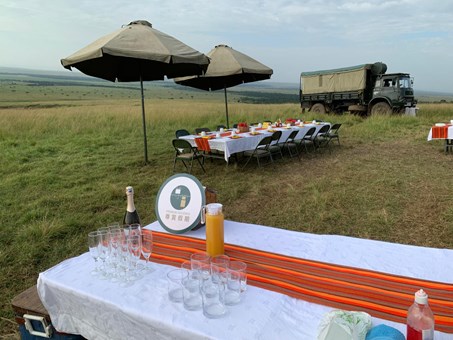 黃昏時份,於原野草原上一邊享用美酒及水果,一邊欣賞非洲日落美景。